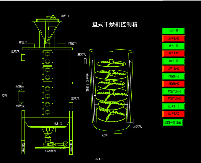 濕物料自加料器連續(xù)地加到干燥器上部第一層干燥盤上,帶有耙葉的耙臂作回轉(zhuǎn)運(yùn)動(dòng)使耙葉連續(xù)地翻抄物料。物料沿指數(shù)螺旋線渡過(guò)干燥盤表面,在小干燥盤上的物料被移送到外緣,并在外緣落到下方的大干燥盤外緣,在大干燥塔上物料向里移動(dòng)并從中間落料口落入下一層小干燥盤中。大小干燥盤上下交替排列,物料得以連續(xù)地流過(guò)整個(gè)干燥器。中空的干燥盤內(nèi)通入加熱介質(zhì),加熱介質(zhì)形式有飽和蒸汽、熱水和導(dǎo)熱油,加熱介質(zhì)由干燥盤的一端進(jìn)入,從另一端導(dǎo)出。已干物料從底層干燥盤落到殼體的底層,然后被耙葉移送到出料口排出。濕份從物料中逸出。由設(shè)在頂蓋上的排濕口排出,真空型盤式干燥器的濕氣由設(shè)在頂蓋上的真空泵抽出。從底層排出的干物料可直接包裝。通過(guò)配加翅片加熱器、溶劑回收冷凝器、袋式除塵器、干料返混木結(jié)構(gòu)、引風(fēng)機(jī)等輔機(jī),可提高其干燥的生產(chǎn)能力,干燥膏糊狀和熱敏性物料,可方便地回收溶劑,并能進(jìn)行熱解和反應(yīng)操作。